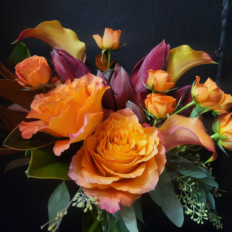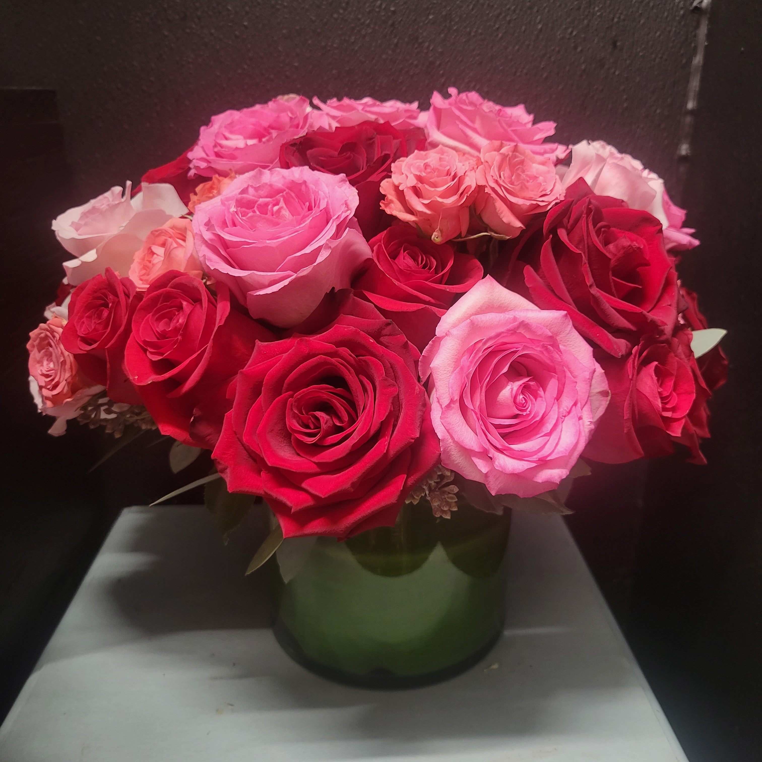 Arrangement with pink roses, spray roses and red roses
